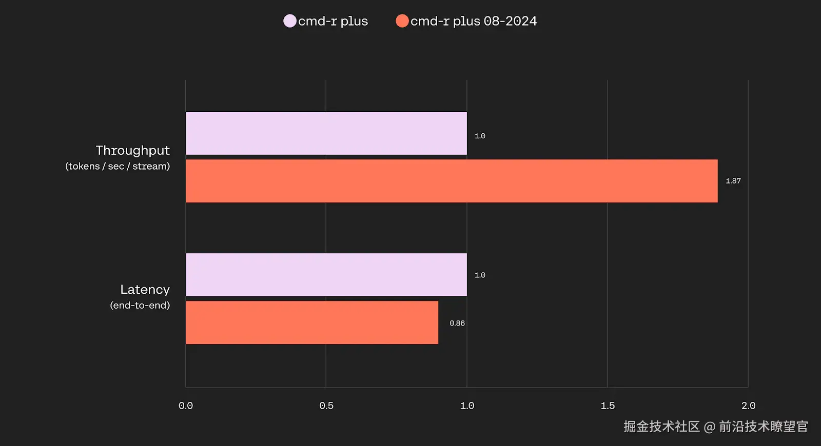 与之前的 Command R 版本相比, command-r-08-2024吞吐量提高了约 50%,延迟降低了 20%,同时将服务模型所需的硬件占用空间减少了一半。同样,与之前的 Command R+ 版本相比, command-r-plus-08-2024吞吐量提高了约 50%,延迟降低了 25%,同时硬件占用空间保持不变。