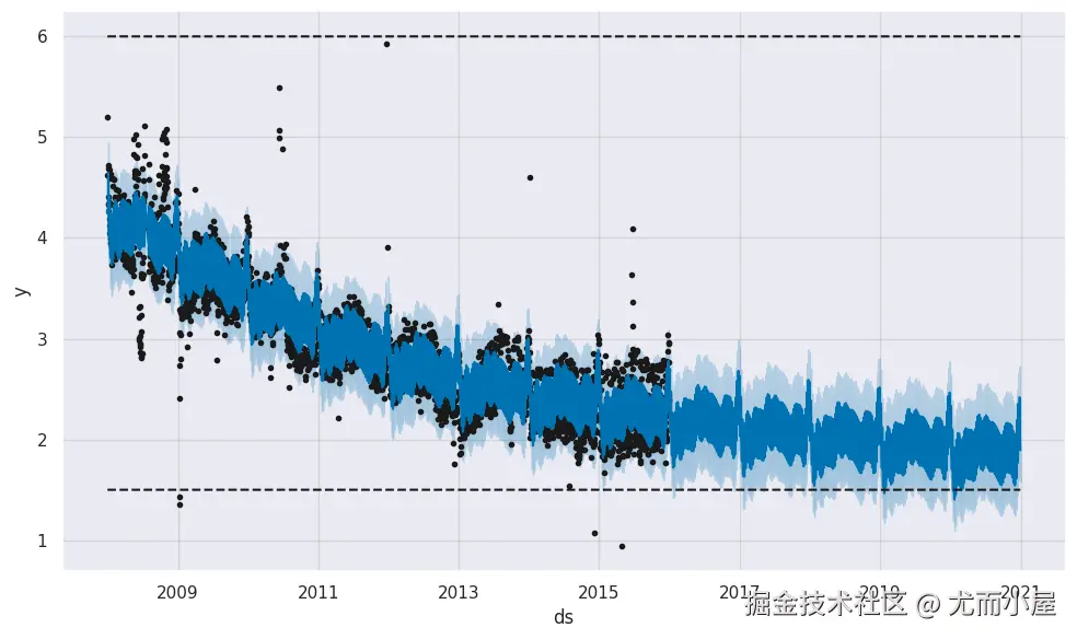 这个时候使用Prophet进行预测时,需要考虑这个上限,可以使用逻辑增长等模型来确保预测值在达到上限后不再增长,而是保持在该水平附近波动。