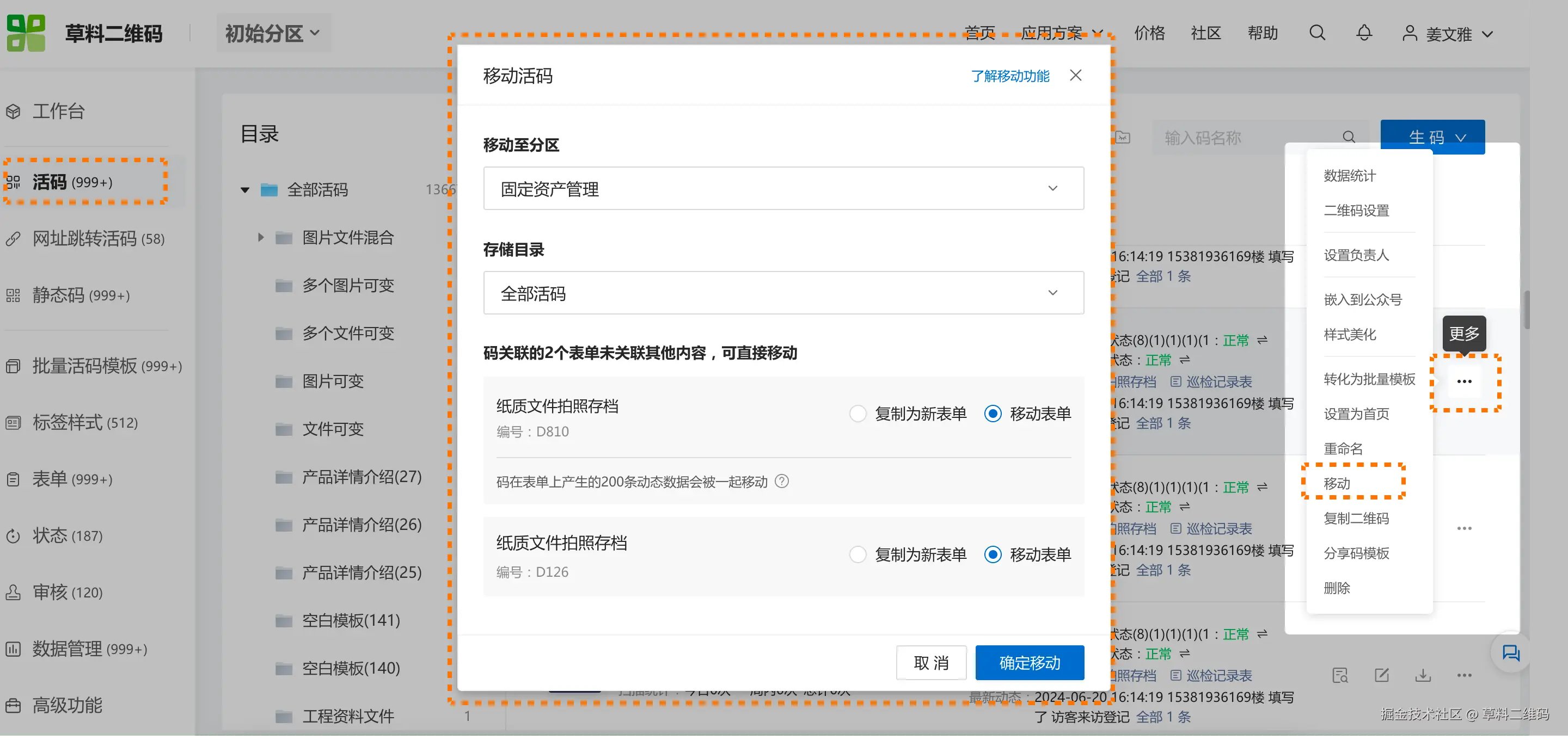 操作入口:活码页面,多选码点击「更多」-「移动」。或者目录点击更多下拉移动。