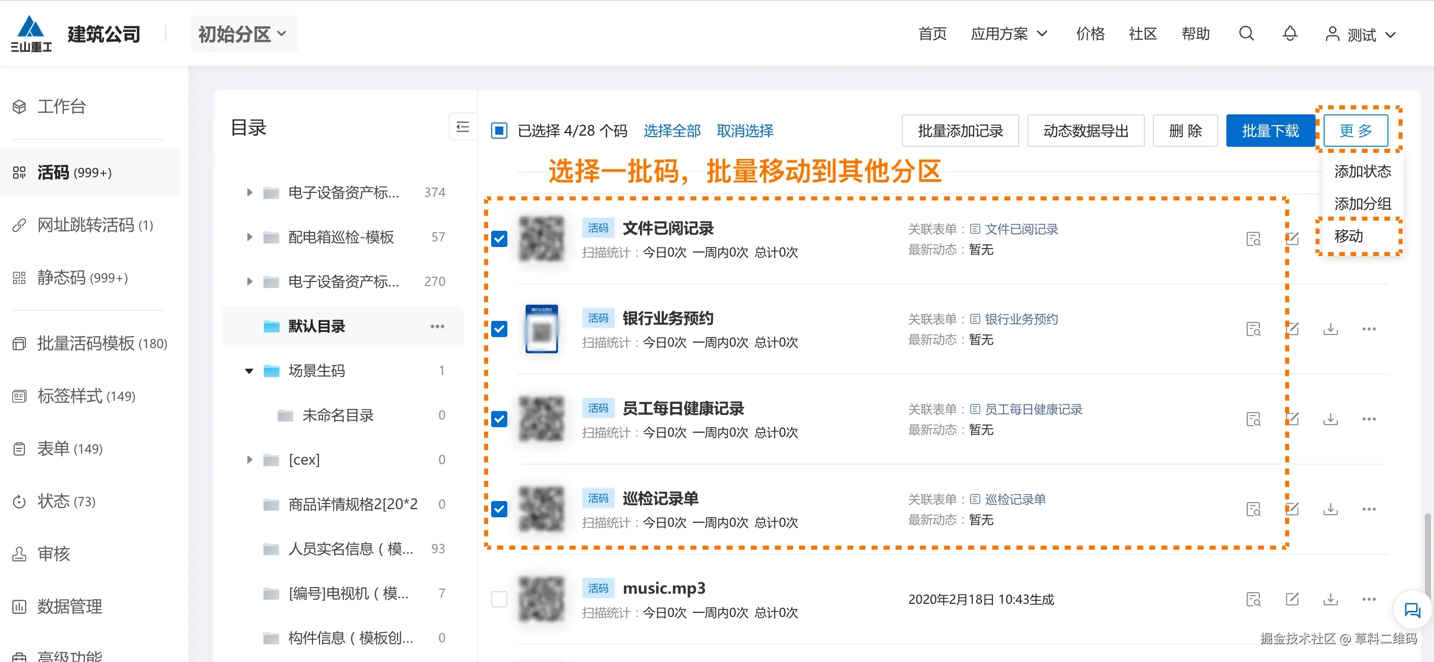 操作入口:可在 批量活码模板页,点击「更多」-「移动」,选择需要移动至的分区。