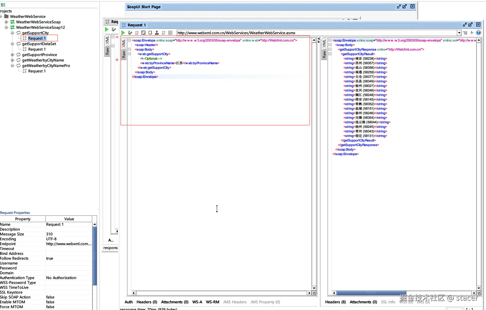 网上有很多使用教程,但是这里使用 SOAPUI 仅是为了查看 SOAP 请求报文,用来在代码中组成一样的请求报文。这里以天气服务为案例,调用两个方法。