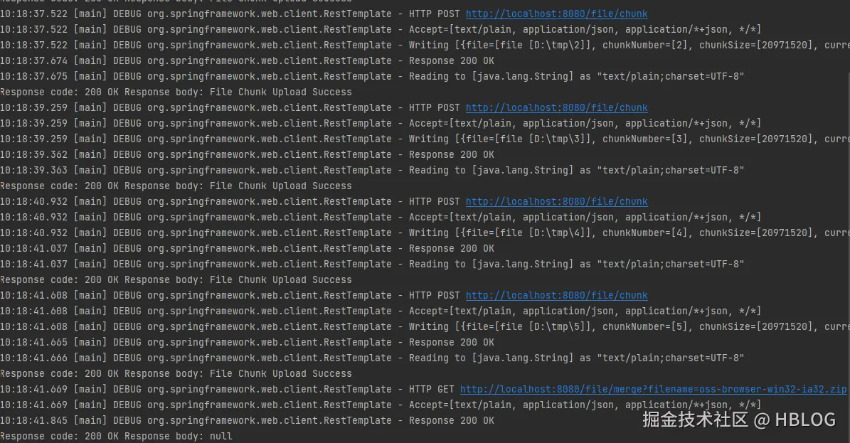 @Test public void testUpload() throws Exception { String chunkFileFolder = "D:/tmp/"; java.io.File file = new java.io.File("D:/SoftWare/oss-browser-win32-ia32.zip"); long contentLength = file.length(); // partSize:20MB long partSize = 20 * 1024 * 1024; // the last partSize may less 20MB long chunkFileNum = (long) Math.ceil(contentLength * 1.0 / partSize); RestTemplate restTemplate = new RestTemplate(); try (RandomAccessFile raf_read = new RandomAccessFile(file, "r")) { // buffer byte[] b = new byte[1024]; for (int i = 1; i <= chunkFileNum; i++) { // chunk java.io.File chunkFile = new java.io.File(chunkFileFolder + i); // write try (RandomAccessFile raf_write = new RandomAccessFile(chunkFile, "rw")) { int len; while ((len = raf_read.read(b)) != -1) { raf_write.write(b, 0, len); if (chunkFile.length() >= partSize) { break; } } // upload MultiValueMap<String, Object> body = new LinkedMultiValueMap<>(); body.add("file", new FileSystemResource(chunkFile)); body.add("chunkNumber", i); body.add("chunkSize", partSize); body.add("currentChunkSize", chunkFile.length()); body.add("totalSize", contentLength); body.add("filename", file.getName()); body.add("totalChunks", chunkFileNum); HttpHeaders headers = new HttpHeaders(); headers.setContentType(MediaType.MULTIPART_FORM_DATA); HttpEntity<MultiValueMap<String, Object>> requestEntity = new HttpEntity<>(body, headers); String serverUrl = "http://localhost:8080/file/chunk"; ResponseEntity<String> response = restTemplate.postForEntity(serverUrl, requestEntity, String.class); System.out.println("Response code: " + response.getStatusCode() + " Response body: " + response.getBody()); } finally { FileUtil.del(chunkFile); } } } // merge file String mergeUrl = "http://localhost:8080/file/merge?filename=" + file.getName(); ResponseEntity<String> response = restTemplate.getForEntity(mergeUrl, String.class); System.out.println("Response code: " + response.getStatusCode() + " Response body: " + response.getBody()); }}