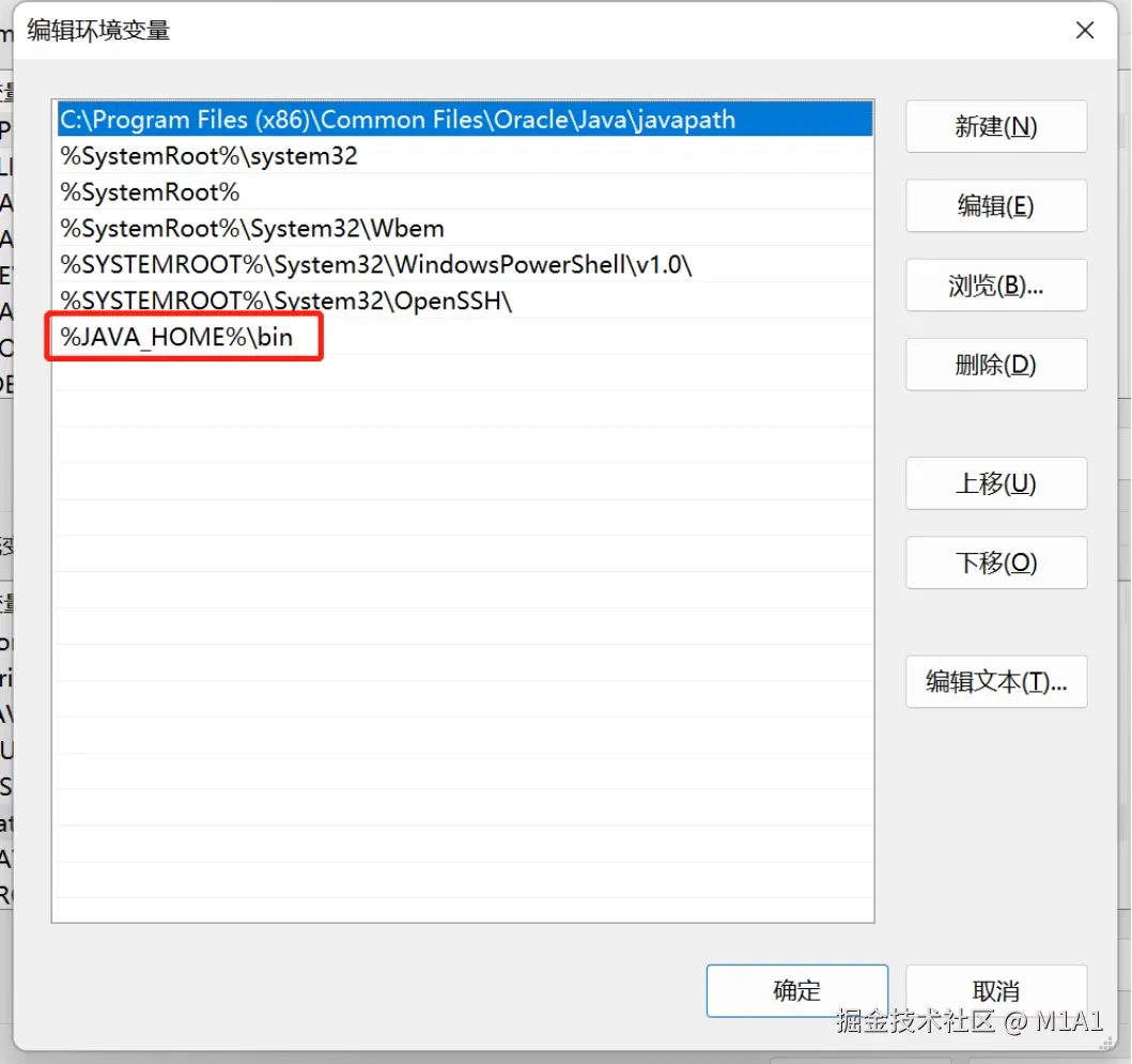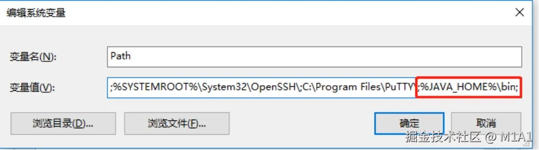 (第一个%前面若没有分号,手动打上去分号【 ;%JAVA_HOME%\bin;】 )