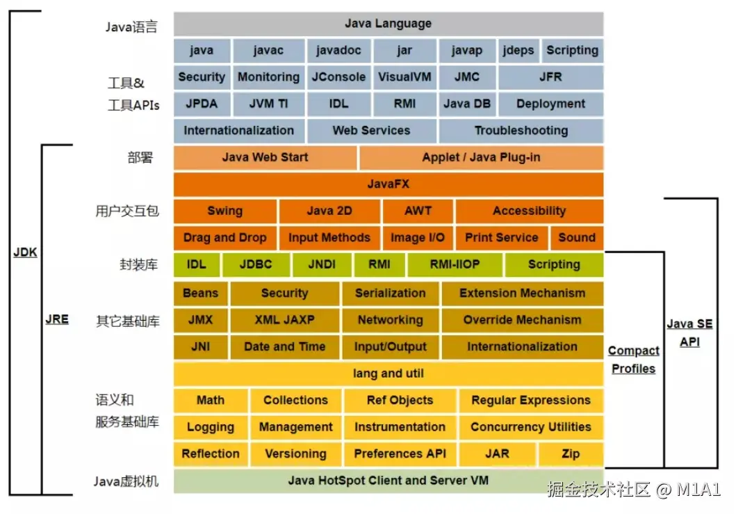 javadoc ) :自动生成 Java 类文档和 API 文档。 - Java 虚拟机(JVM) :执行 Java 字节码,并提供了内存管理、垃圾回收等功能。