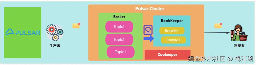 - BookKeeper(Bookies) :提供持久化存储,将消息存储在多个 Bookie 中,确保数据可靠。