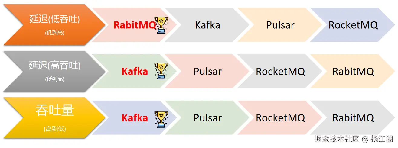 - RabbitMQ:灵活性和可靠性较高,但吞吐量最低。