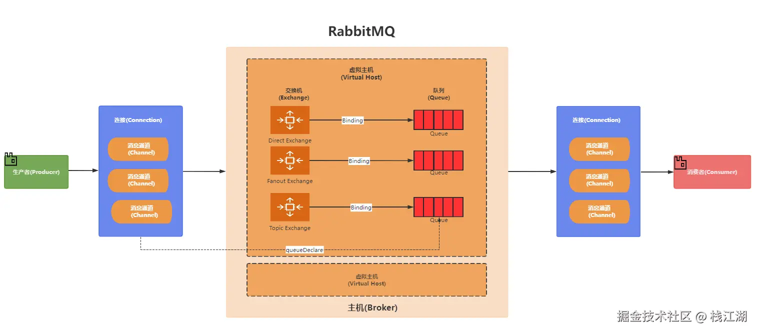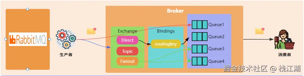 - 队列(Queue) :存储消息,消费者从队列中消费消息。