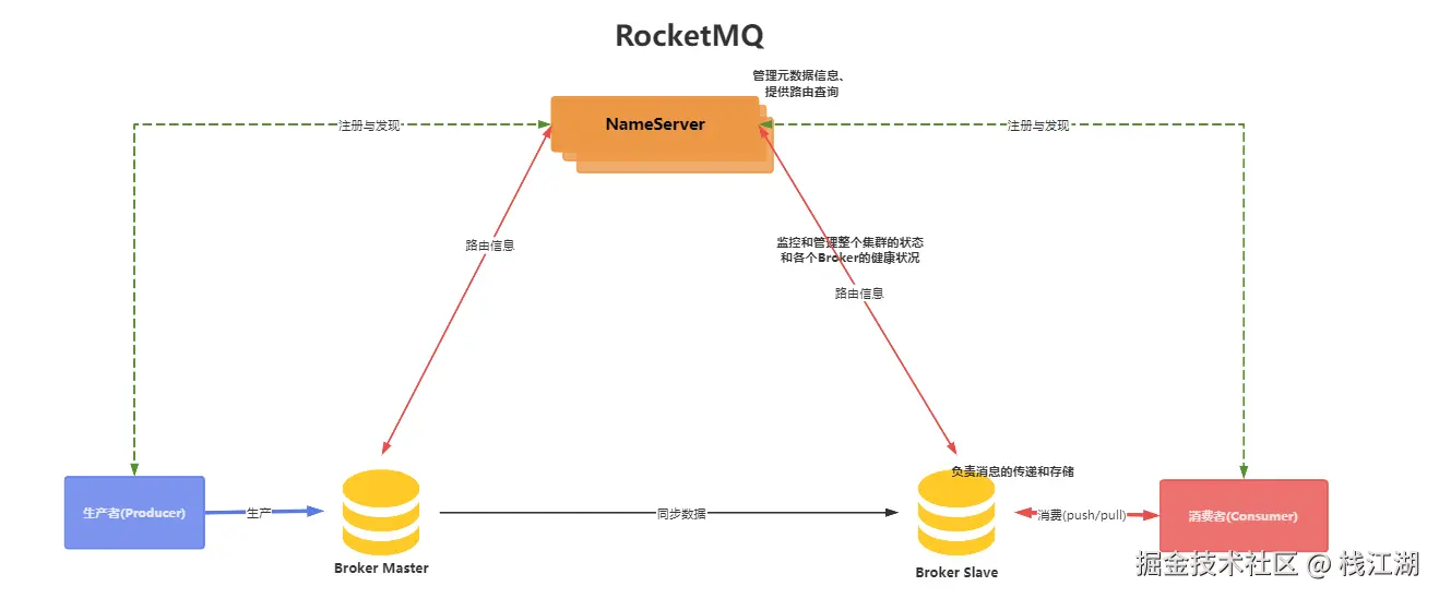 - 名称服务器(Name Server) :管理主题和消息队列的元数据,提供路由信息。