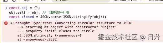 如果对象中存在循环引用,调用 JSON.stringify 会抛出错误,导致克隆失败