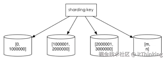 - 范围分片。比如用户id从1-100,000放到0分库,100,001到200,000放到1分库,以此类推。