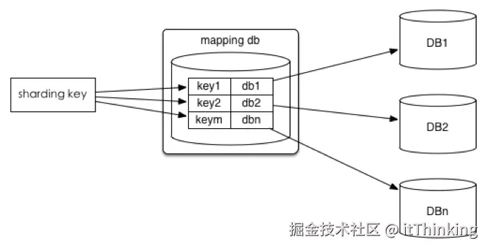 - 查找映射:直接定义分片和分片键值之间的映射关系,将其维护在配置或数据库中。为了提高查询性能,通常配合缓存一起使用。