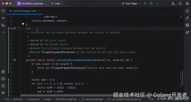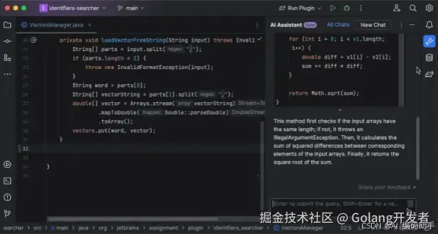 通常我们都要求命名要见名知意,由于某些同学词汇匮乏等原因导致命名不尽人意,使用 AI Assistant 可以根据方法的内容建议合适的命名。目前 Java、Kotlin 和 Python 支持此功能。