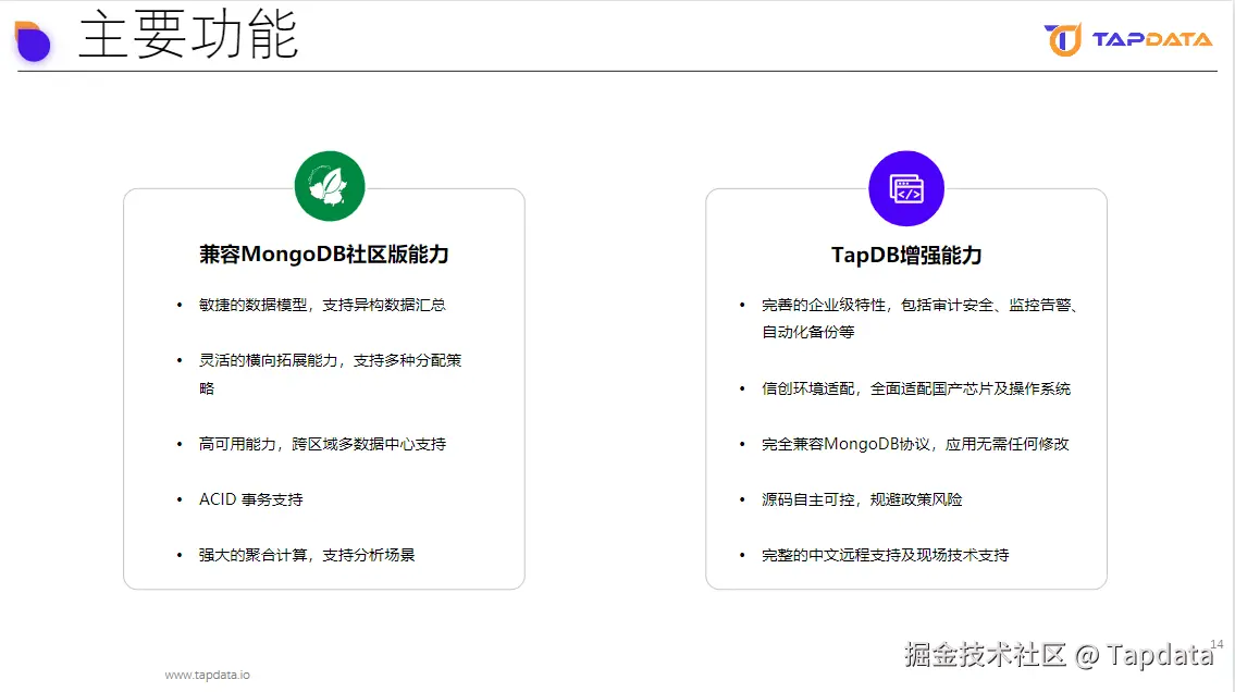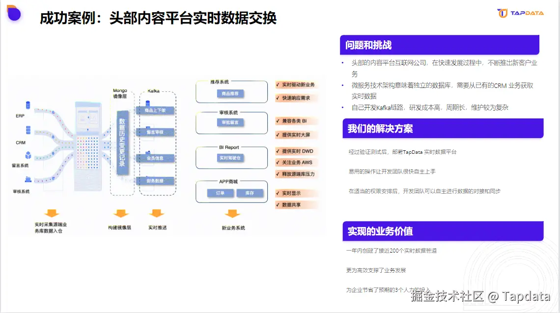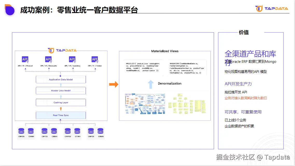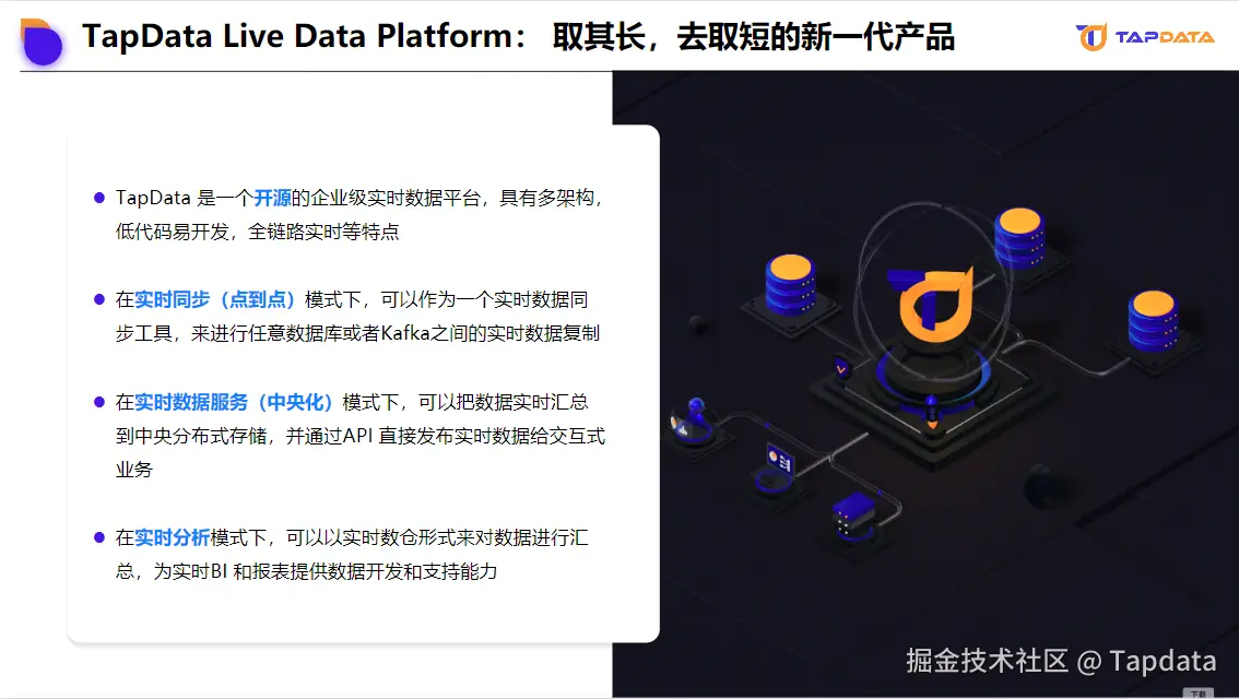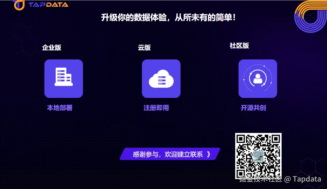 TapData Inc.「深圳钛铂数据有限公司」,成立于2019年9月,核心员工来自 MongoDB、Oracle、百度等,研发人员占比超80%,至今已获五源资本等多家头部风投数千万美元融资。已服务中国移动、中国联通、南方电网、中国一汽、中芯国际、周生生、富邦银行等数十家行业标杆企业。TapData 坚持“开放+开源”战略,推出 Tapdata Cloud,将无代码数据实时同步的能力以 SaaS 的形式免费开放,目前已积累 1,000+ 云版和企业版客户,覆盖金融、制造、零售、能源、政府等多个行业。此外,TapData 社区版也已发布,正在面向开发者逐步共享其核心功能。