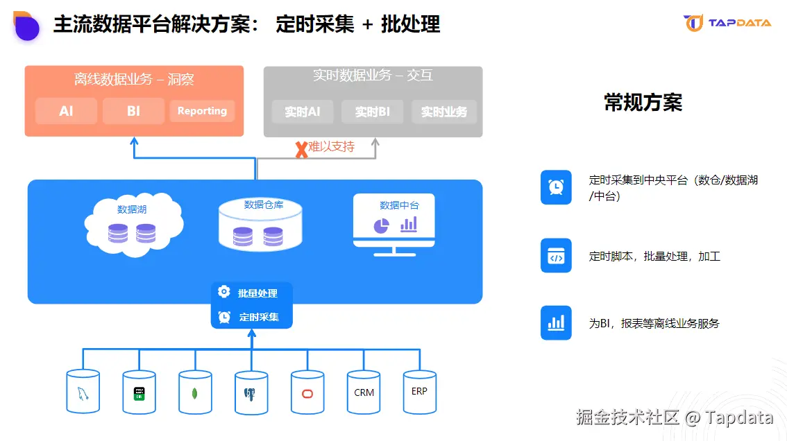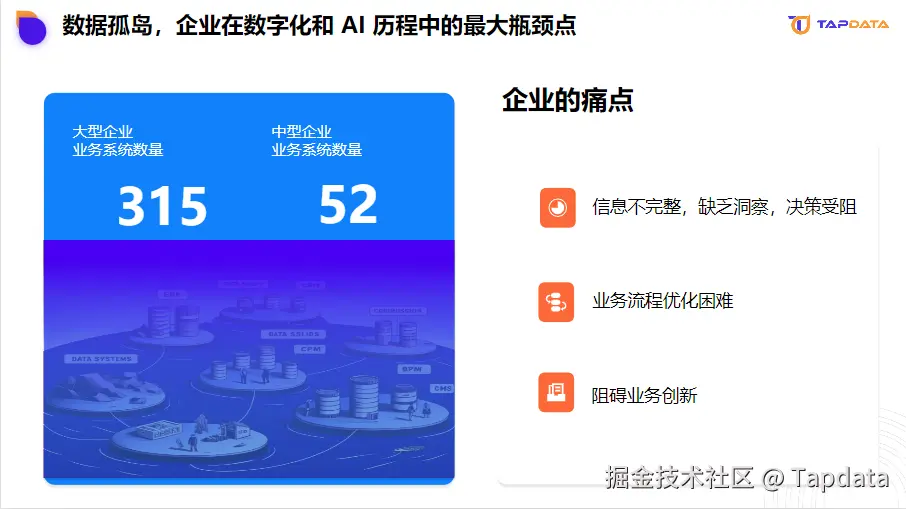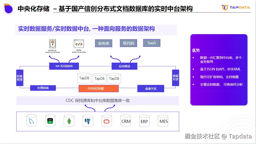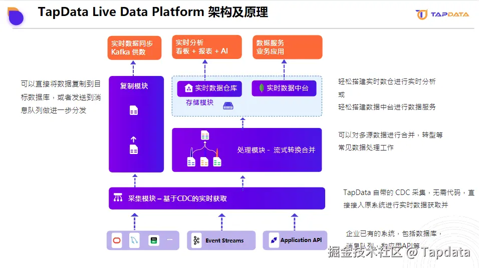 Tapdata Live Data Platform 是一个以低延迟数据移动为核心优势构建的现代数据平台。企业可以用来实现核心数据系统之间的实时同步、实时交换及实时处理。当实时数据需求日益增多时,企业可以结合分布式存储,使用 Tapdata 将孤岛数据无缝集中到中央数据平台,为众多下游业务提供一站式的实时数据交换和发布服务。