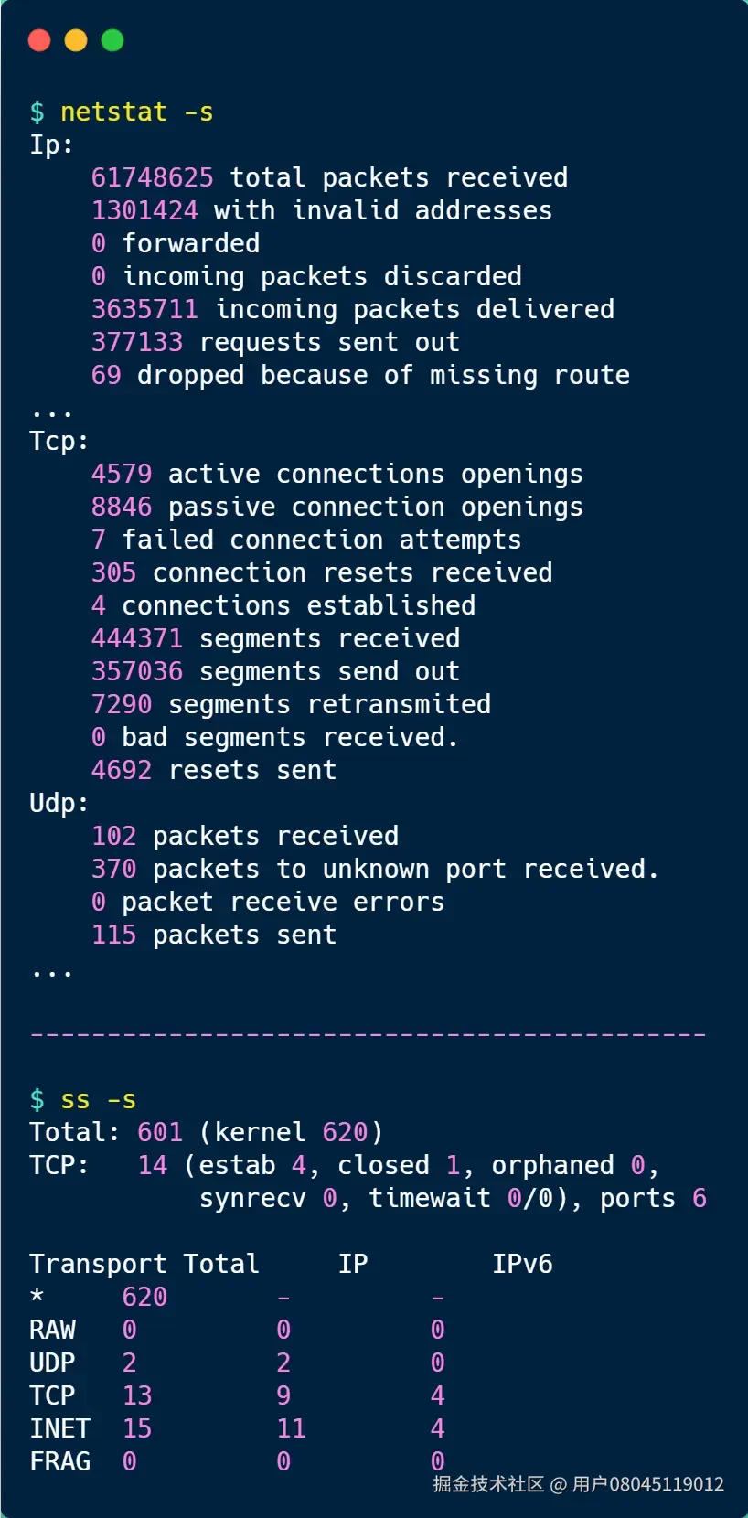 那对于协议栈的统计信息,依然还是使用 netstat 或 ss,它们查看统计信息的命令如下: