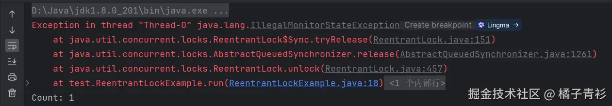 import java.util.concurrent.locks.ReentrantLock; public class ReentrantLockExample implements Runnable { private static ReentrantLock lock = new ReentrantLock(); private static int count = 0; @Override public void run() { lock.lock(); try { count++; } finally { lock.unlock(); lock.unlock(); } } public static void main(String[] args) throws InterruptedException { ReentrantLockExample example = new ReentrantLockExample(); Thread thread1 = new Thread(example); thread1.start(); thread1.join(); System.out.println("Count: " + count); } }运行结果: