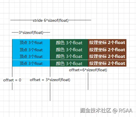 最后的两列就是我们的纹理坐标。内存分布如下图所示: