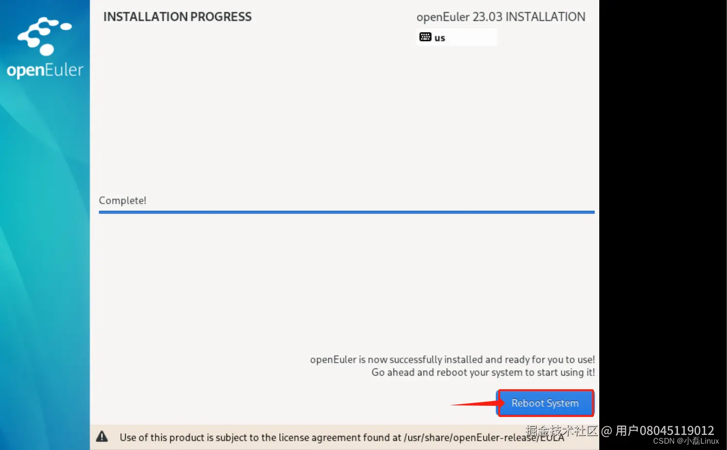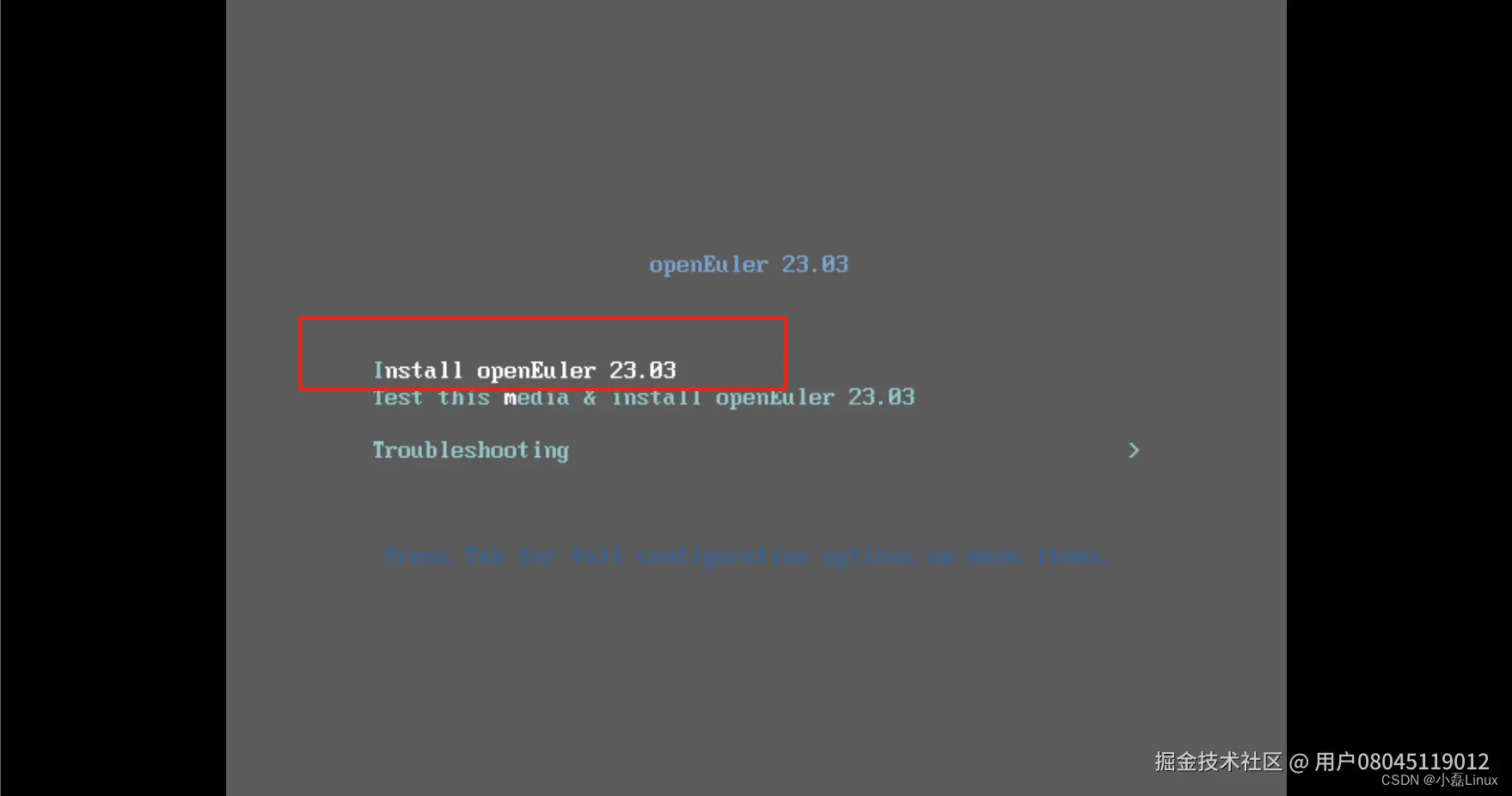 2.2.5 进入到openEuler的安装界面,用键盘上键选择第一项【选择第一个选项,直接安装,第二个选项测试并安装】
