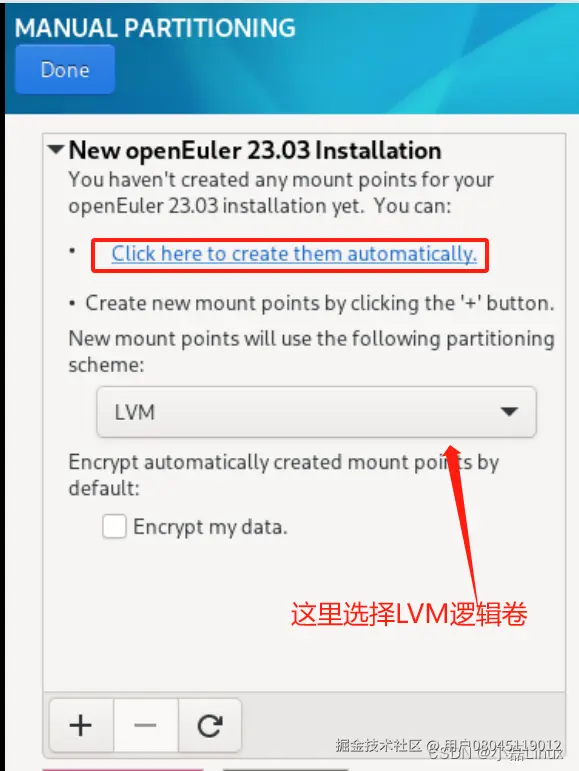 2.2.9 点击蓝色字体创建分区,默认为LVM逻辑卷即可