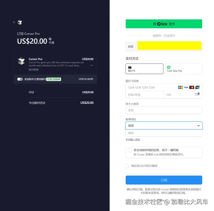 众所周知的原因,在国内使用Cursor时所必须要魔法上网。而试用期结束后,Cursor要怎么付费也是一个挑战,这需要准备一个海外邮箱、国际支付银行卡(大陆/HK发行的卡都用不了)和卡对应的海外地址。