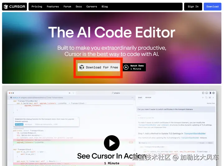 安装和配置Cursor十分简单!进入官方网站(Cursor),点击下载就可以了。下载是完全免费的,有两周的Pro免费试用。