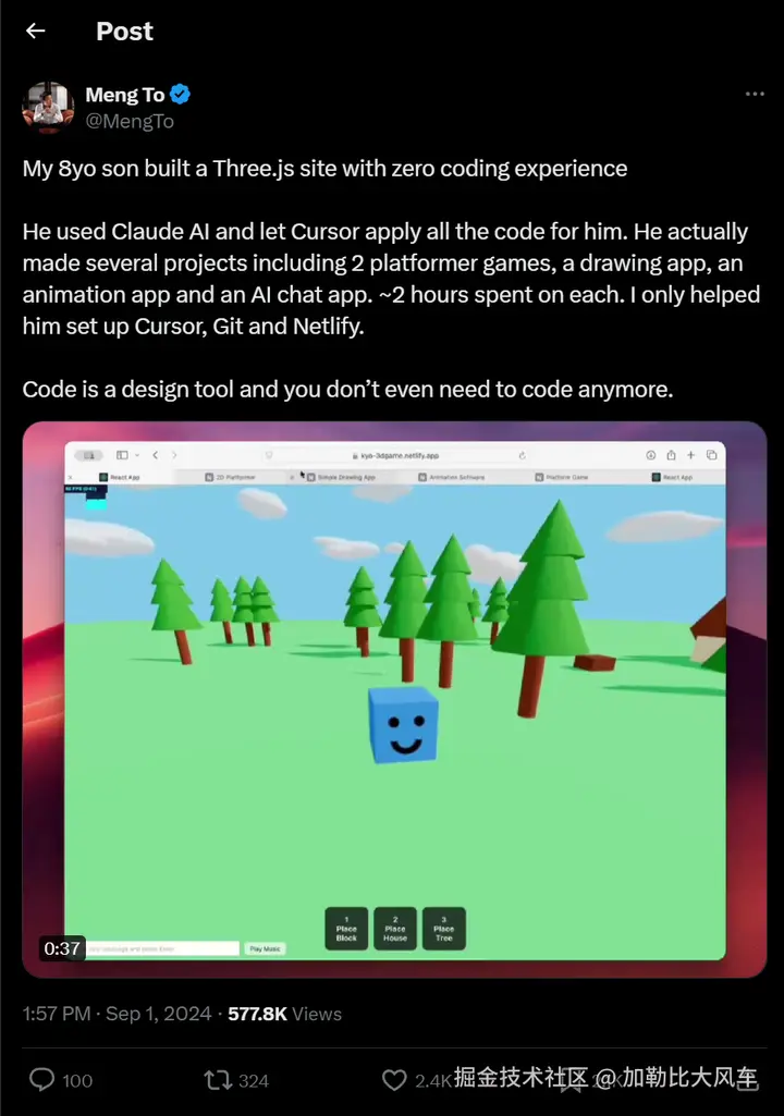 最近,我在X上看到有8岁的孩子用Cursor做出了3D游戏。一开始我还以为是玩笑,结果仔细一看,才发现这个AI的能力确实有点夸张。(x.com/MengTo/stat…