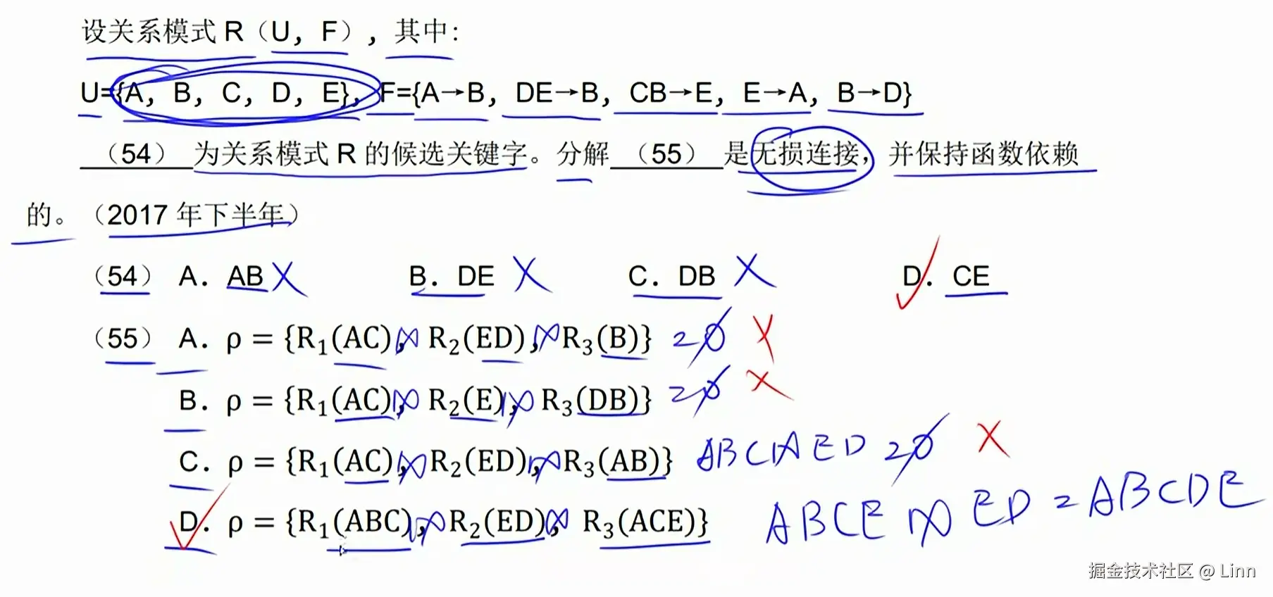 - 以该属性为基础依次扩展,看能否遍历出来所有属性,不能遍历到的也加入候选码中