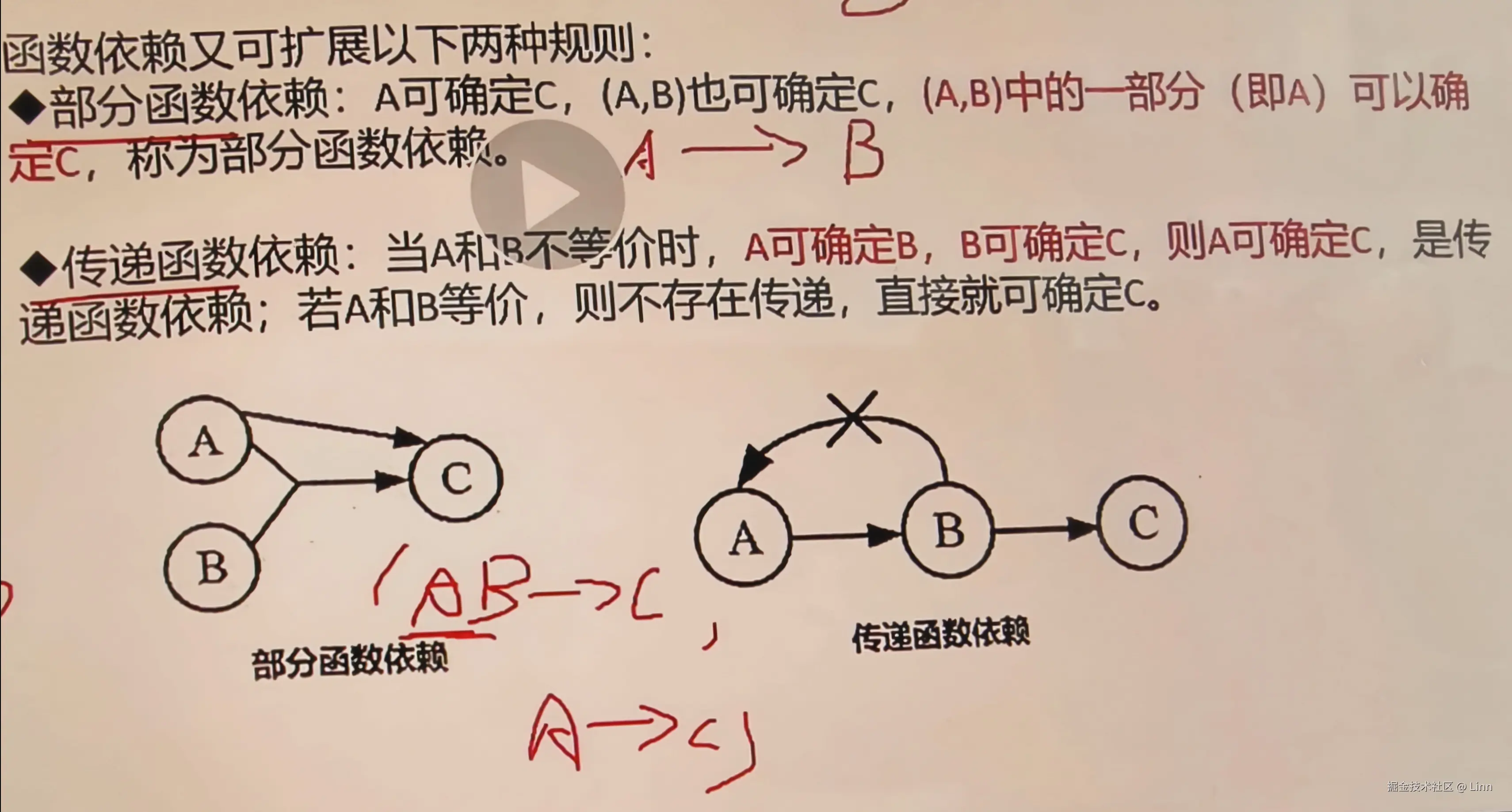 - 传递依赖(至少 3 个属性才可能传递)