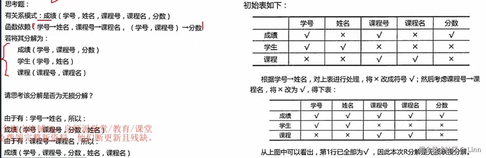 三个及以上关系模式通过表格法求解,将所有属性排成列,然后按分解排成每一行,根据依赖关系打✓,如果有一行全是✓就说明是无损连接