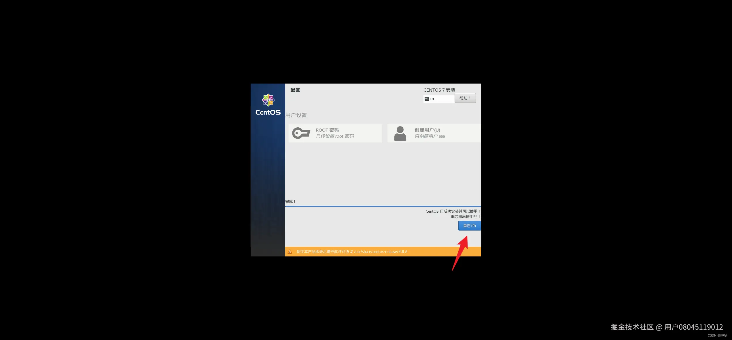等待安装完成,然后重启虚拟机