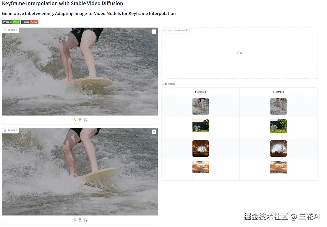 来了来了,前几天介绍的 Generative Inbetweening[6] 现已发布演示,来自我们的 Space 小王子 @fffiloni 发布的:svd_keyframe_interpolation[7]