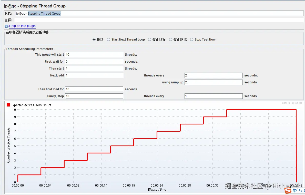 如果我们这里选择此种模式,然后设定了是10个线程,那么我们前面的Target throughput就应该填写1200/10=120 或 20/10*60=120了;