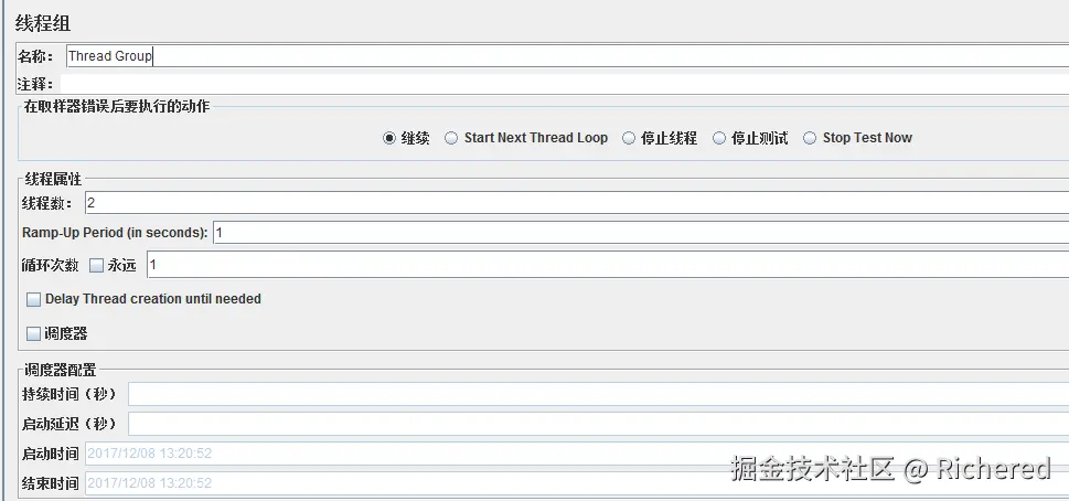 线程组加入线程数2,斜坡时间1s,循环一次。