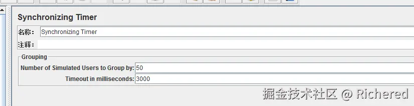 0is equivalent to setting it to Number of threads in Thread Group. | Yes | | Timeout in milliseconds | If set to0, Timer will wait for the number of threads to reach the value in "Number of Simultaneous Users to Group". If superior to0, then timer will wait at max "Timeout in milliseconds" for the number of Threads. If after the timeout interval the number of users waiting is not reached, timer will stop waiting. Defaults to0| No | | If timeout in milliseconds is set to0and number of threads never reaches "Number of Simultaneous Users to Group by" then Test will pause infinitely. Only a forced stop will stop it. Setting Timeout in milliseconds is an option to consider in this case. | | ------------------------------------------------------------------------------------------------------------------------------------------------------------------------------------------------------------------------------------------------------------------ | | Synchronizing timer blocks only within one JVM, so if using Distributed testing ensure you never set "Number of Simultaneous Users to Group by" to a value superior to the number of users of its containing Thread group considering 1 injector only. | | -------------------------------------------------------------------------------------------------------------------------------------------------------------------------------------------------------------------------------------------------------- | | | | | ------------------------------------------------------------------------------------------------------------------------------------------------------------------------------------------------------------------------------------------------------------------------------------------------------------------------------------------------------------------------------------------------------------------------------------------------------------------------------------------------------------------------------------------------------------------------------------------------------------------------------------------------------------------------------------------------------------------------------------------------------------------------------------------------------------------------------------------------------------------------------------------------------------------------------------------------------------------------------------------------------------------------------------------------------------------------------------------------------------------------------------------------------------------------------------------------------------------------------------------------------------------------------------------------------------------------------------------------------------------------------------------------------------------------------------------------------------------------------------------------------------------------------------------------------------------------------------------------------------------------------------------------------------------------------------------------------------------------------------------------------------------------------------------------------------------------------------------------------------------------------------------------------------------------------------------------------------------------------------------------------------------------------------------------------------------------------------------------------------------------------------------------------------------------------------------------------------------------------------------------------------------------------------------------------------------------------------------------------------------------------------------------------------------------------------------------------------------------------------------------------------------------------------------------------------------------------------------------------------------------------------------------------------------------------------------------------------------------------------------------------------------------------------------------------------------------------------------------------------------------------------------------------------------------------------------------------------------------------------------------------------------------------------------------------------------------------------------------------------------------------------------------------------------------------------------------------------------------------------------------------------------------------------------------------------------------------------------------------------------------------------------------------------------------------------------------------------------------------- | - | - | | | | | ------------------------------------------------------------------------------------------------------------------------------------------------------------------------------------------------------------------------------------------------------------------------------------------------------------------------------------------------------------------------------------------------------------------------------------------------------------------------------------------------------------------------------------------------------------------------------------------------------------------------------------------------------------------------------------------------------------------------------------------------------------------------------------------------------------------------------------------------------------------------------------------------------------------------------------------------------------------------------------------------------------------------------------------------------------------------------------------------------------------------------------------------------------------------------------------------------------------