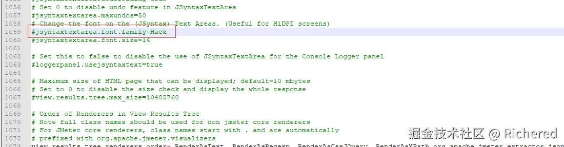 解决方案:在jmeter.properties中查找jsyntaxtextarea.font.family,取消注释,使用hack字体即可(当然也可以换成支持的其他字符集)