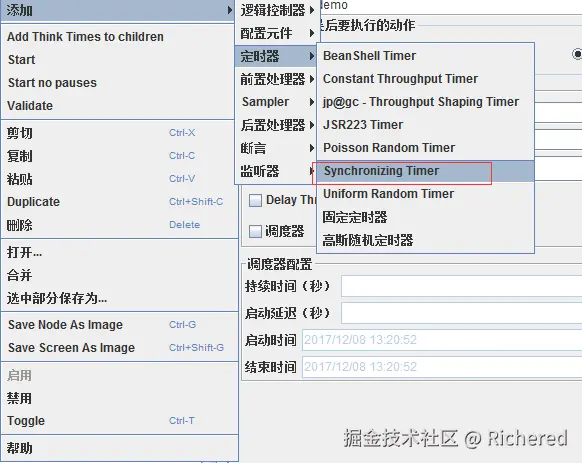 SycTimeType的目的是阻止线程,直到X个线程被阻塞,然后它们都被立即释放。因此,同步计时器可以在测试计划的各个点创建大的即时负载。(百度翻译)
