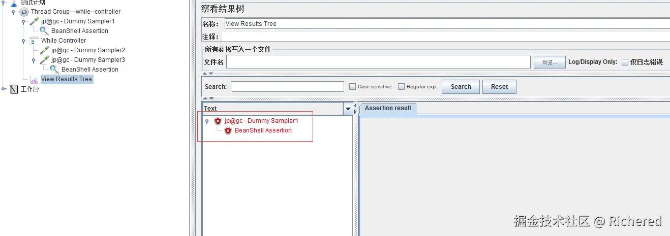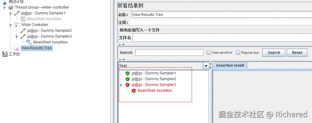 以Dummy Sampler为例,添加了三个Dummy Sampler,1是有失败断言的,按照while的条件LAST,1如果失败,不会进入while中。执行以下: