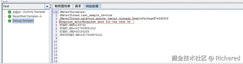 可以看到无论是测试计划中的变量还是外部文件的变量,DebugSampler在响应报文中都打印了出来,有这样的功能就定位问题速度便会提升好多。