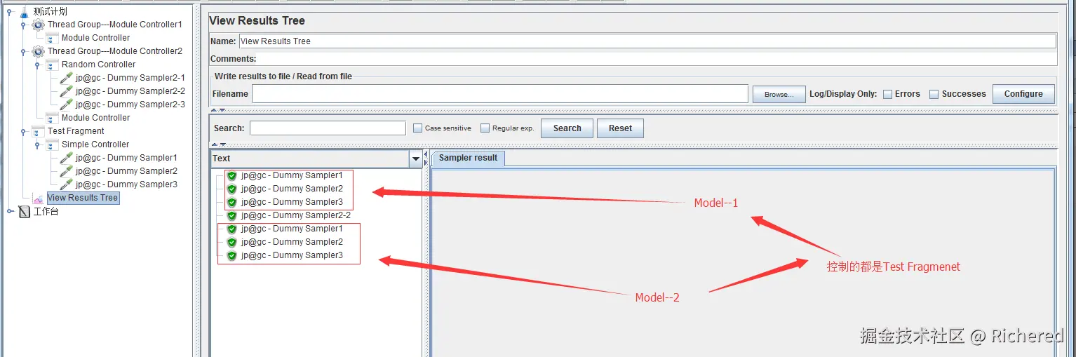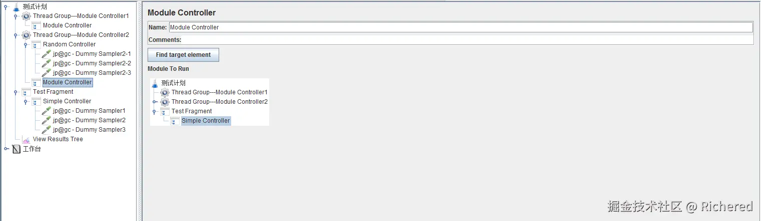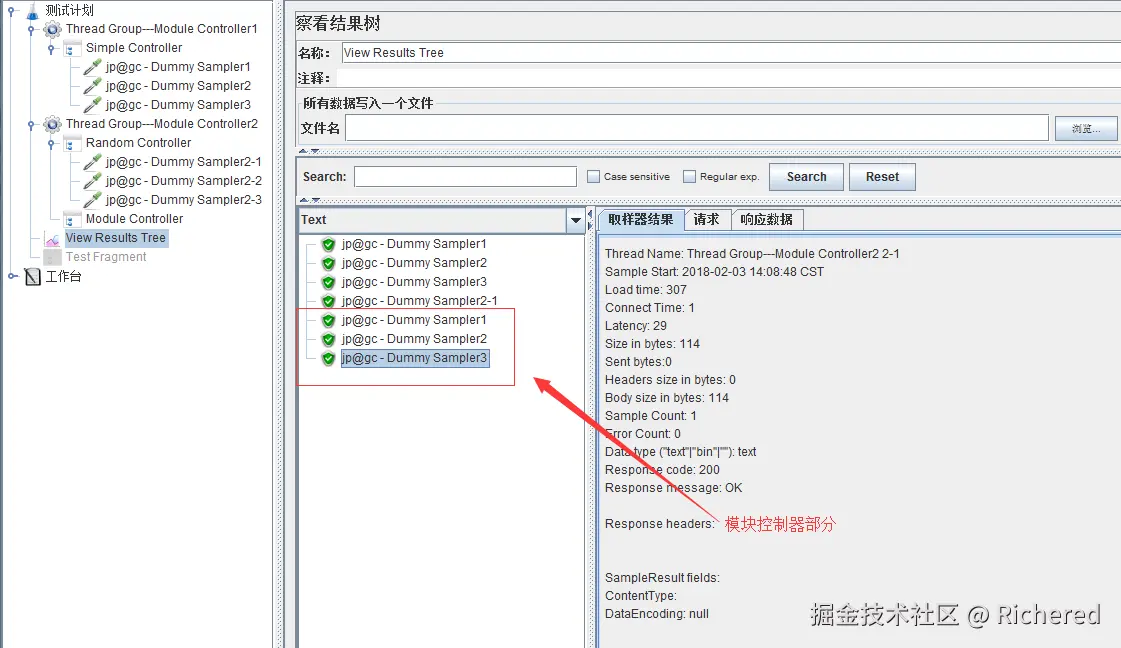 结果树中是从线程组2开始执行,Module Controller依然可以控制到线程组1中的Dummy Sampler。