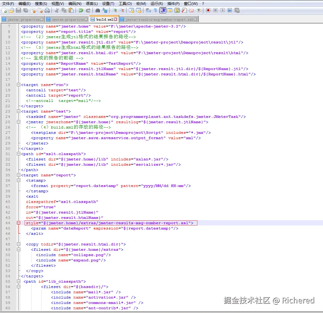 可以将该段代码写入一个.xsl文件中,在build.xml文件中指向该样式。对了,还有一个需要注意的地方,就是,务必将Build.xml文件的编码格式和该样式的编码格式统一,不然,构建之后会出现中文乱码的情况。