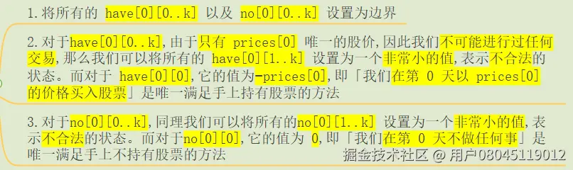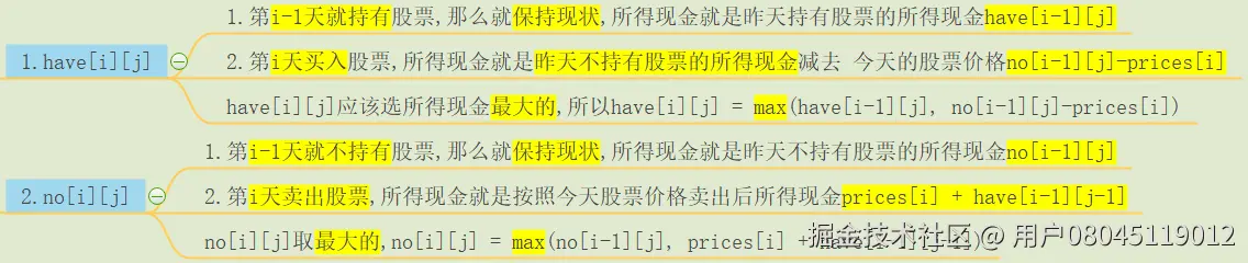 根据上面我们定义的k何时变化, 体现在递推公式中就是在推导no[i][j]的第二种情况时用到的have[i-1][j-1], 因为卖出股票时k会变化, 所以上一个持有股票的状态就是k-1了. 这点一定要注意, 它不止在递推公式中很重要, 也在之后的空间优化时很重要!