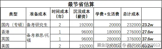 如果是国内两年的专硕,脱产去读,失去两年薪资(算一个月8k)就是 19.2w,再加上你的硕士学费 大致是八千到一万五一年,我们就算1万/年吧,生活费再加1万/年,加上2年工资那就是23.2万。