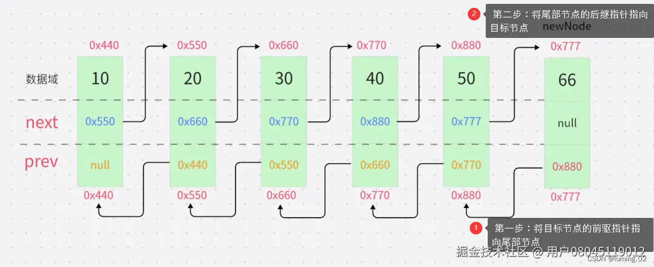 当队列为空的时候需要进行特殊处理,不然会造成空指针异常,队列为空的时候让我们的头指针和尾指针都指向这个节点就可以,如果队列不为空就正常的使用尾插法,尾插法图示: