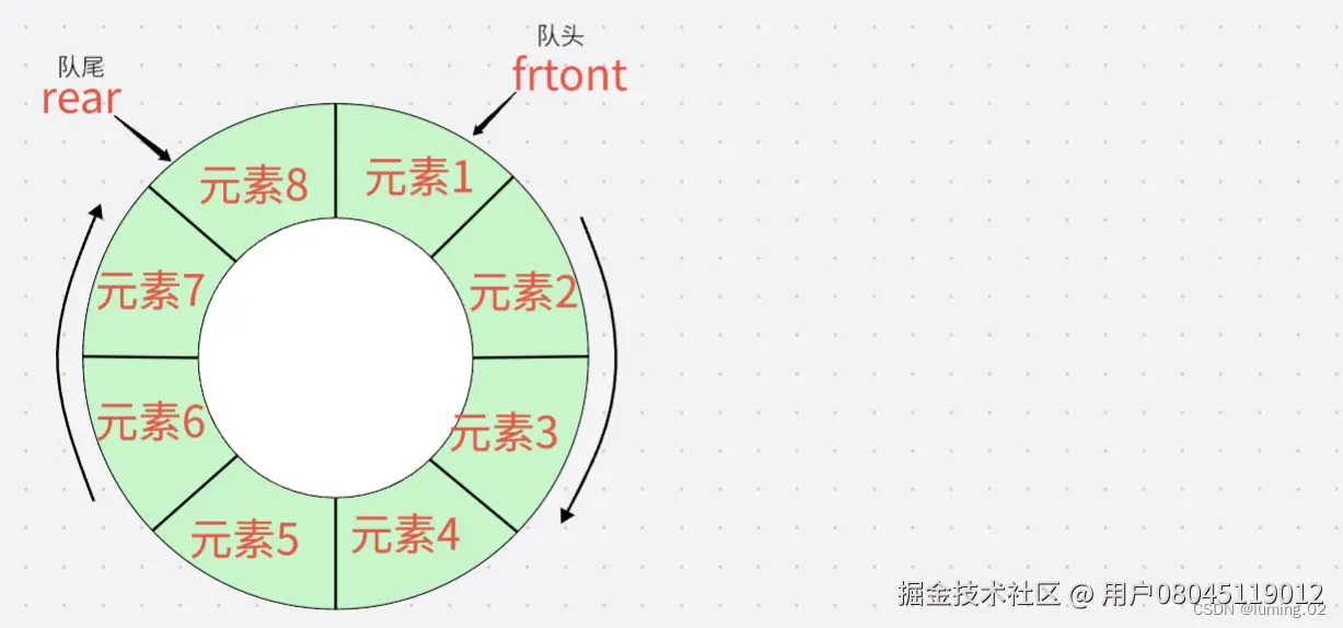 对于循环队列,我们可以使用数组来模拟实现,分别有俩个指针指向整个数组的首部和尾部