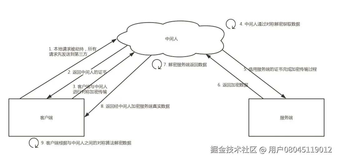 客户端创建随机数,通过中间人证书的公钥对随机数加密后传送给中间人,然后凭随机数构造对称加密对传输内容进行加密传输。