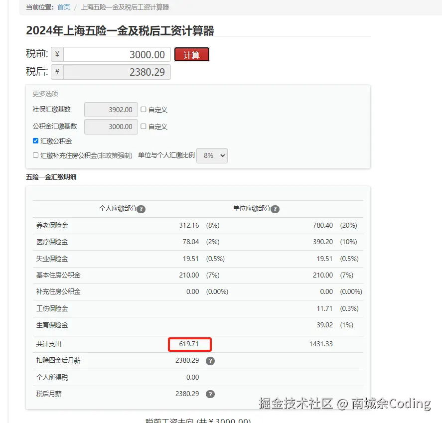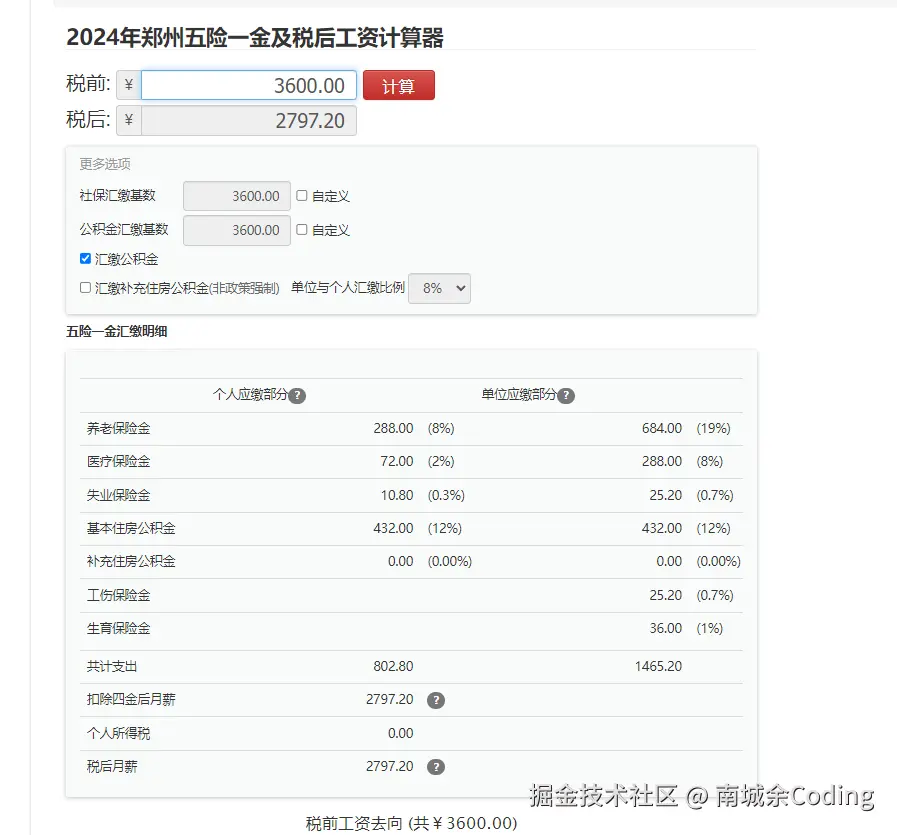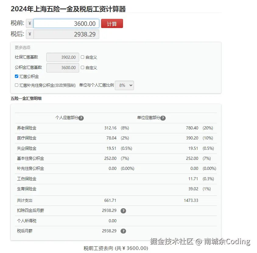 然后又看了看上海地区的 3600 个人要交的五险一金。
