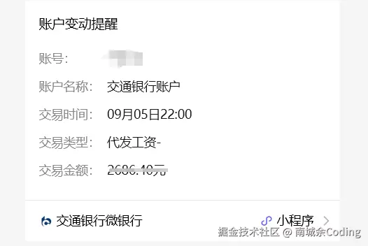 当看到交通银行订阅号给我推送工资的时候,我高兴地看了一眼工资竟然才 2600 +,不到 2700,我顿时产生了怀疑。