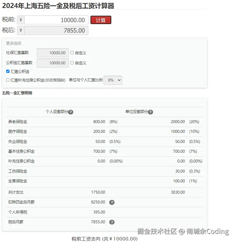 那上海一万,实际到手为多少呢,且看下图。