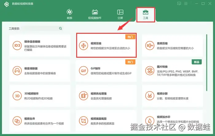 第一步: 打开数据 蛙视频转换器,点击 【工具箱】 → 【视频压缩】 功能,导入目标mp4文件。